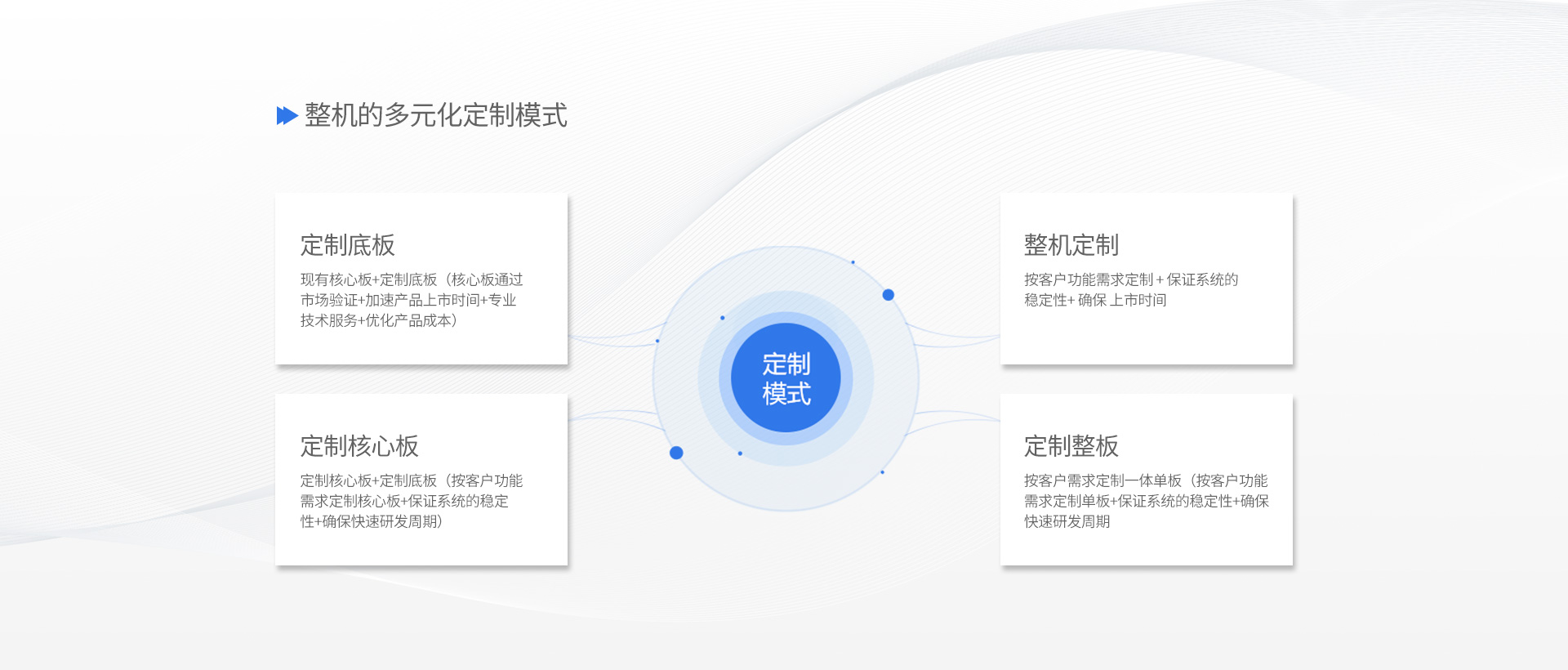 由于產(chǎn)品需求,需要我們協(xié)助完成部分軟硬件功能,為此我們推出了多樣化服務(wù),板級(jí)、整機(jī)及相關(guān)軟硬件設(shè)計(jì),為你定制各種外圍接口及相關(guān)驅(qū)動(dòng)和系統(tǒng),可快速、有效地在最短時(shí)間內(nèi)增加一些額外配置需求或開發(fā)出目前最新的、性能最先進(jìn)的ARM架構(gòu)片上系統(tǒng),以滿足特定需求,有助于產(chǎn)品的快速升級(jí)。